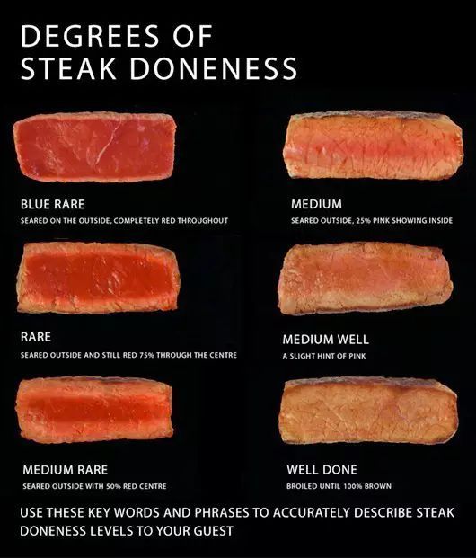 大部分肉接受热量渗透传至里面,但还未产生大变化,切开后 上下两侧熟肉棕色,向里面处转为粉色再然后里面为鲜肉色,伴随刀切有血渗出。(新鲜牛肉和较厚牛排这种层次才会明显,对冷冻牛肉和薄肉排很难达到这种效果)。